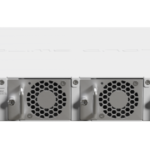 The two hot-swap power supplies support a high input voltage range: 100-240V. The board itself uses up to 45W of power, while the total maximum power consumption goes up to 77W with all the attachments. It can be a bit more power-hungry than the CRS504, but you would be too if you had 16x 25-Gigabit ports, wouldn’t you?