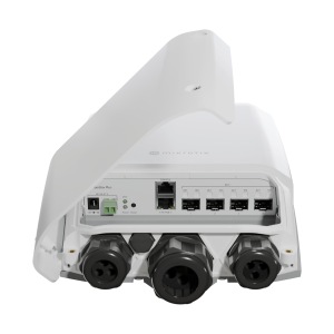 This rugged outdoor switch is perfect for connecting mast devices. Like the mANTBox 52 or the LHG XL 52. Imagine a huge campsite with several guest houses, a food court, and the owner’s cabin. You can connect all the locations with the FiberBox Plus. One of the fiber connections can be used for the mANTBox base station – to provide general connectivity for the guests. Another connection could go to the owner’s house. And the third could be used in the food court – to connect their payment and inventory servers.